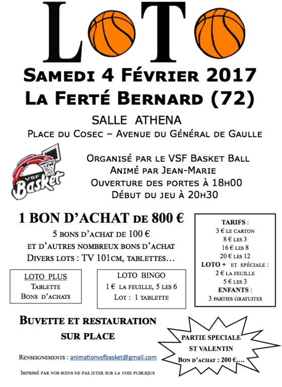 Nous vous rappelons l'organisation de notre loto le samedi 4 février 2017 (ouverture des portes à 18h). De nombreux bons d'achat, dont le gros lot de 800 €, une TV 43', 4 tablettes, une enceinte bluetooth, 4 places VIP au MSB, des chèques gourmands, etc. sont à gagner !