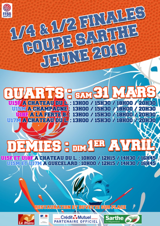 Ce week-end se dérouleront les 1/4 de finale Coupe Sarthe Jeunes. Nos U17 garçons iront affronter le Mans SCM à Château du Loir à 15h30.
