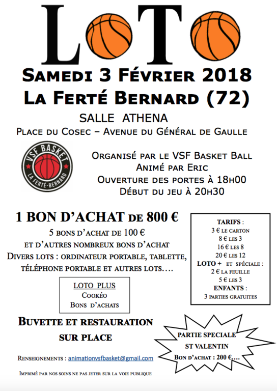 Nous vous rappelons l'organisation de notre loto le samedi 3 février 2018. De nombreux bons d'achat, dont le gros lot de 800 €, un ordinateur portable, un "cookéo", une tablette, une cafetière "nespresso", des chèques gourmands, etc. sont à gagner ! Venez nombreux et n'hésitez pas à en parler autour de vous !