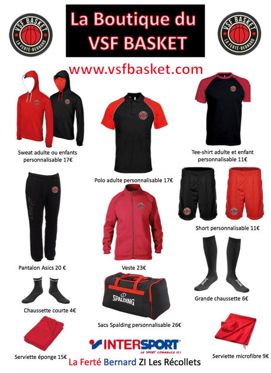 Choisissez vos articles et vos éventuelles options, remplissez votre panier et validez-le. Vous pourrez ensuite donner votre paiement (par chèque de préférence) à Aurélien Joubert ou l'envoyer à : VSF Basket - Maison des Sports - Avenue Général de Gaulle - 72400 La Ferté-Bernard.