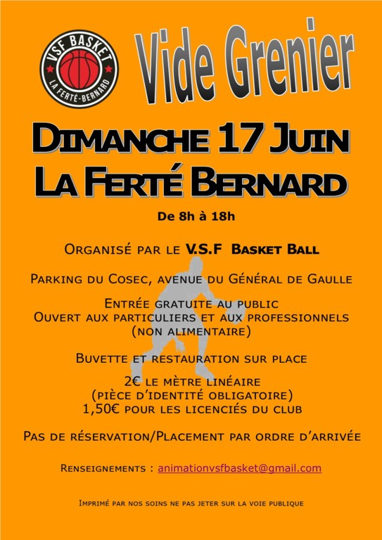 Le traditionnel vide grenier du VSF BASKET se déroulera le DIMANCHE 17 JUIN.