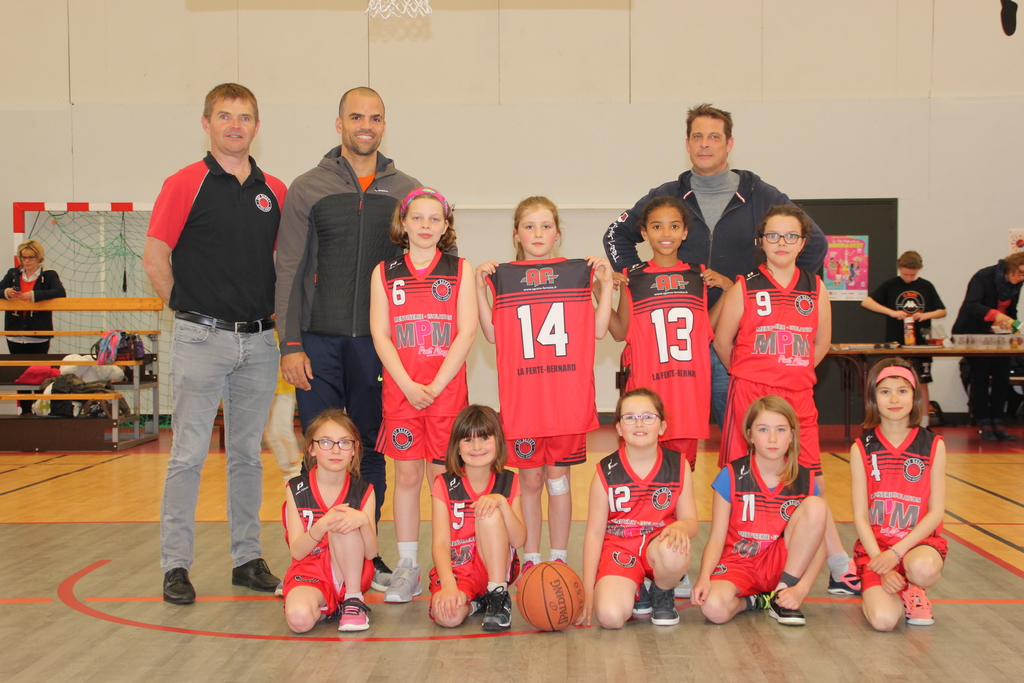Ce samedi 11 mai, l'équipe des U11 féminines avec leur coach Rodolphe REJON s'est vue remettre son nouveau jeu de maillots par le Président Stéphane ROSSIGNOL. Cela a pu être réalisé grâce au partenariat avec 2 entreprises de la région : La Menuiserie - Ebénisterie MPM située à Duneau et représentée par M. Christophe PINET (à droite sur la photo) et l'Agence Fertoise Immobilière à La Ferté-Bernard.