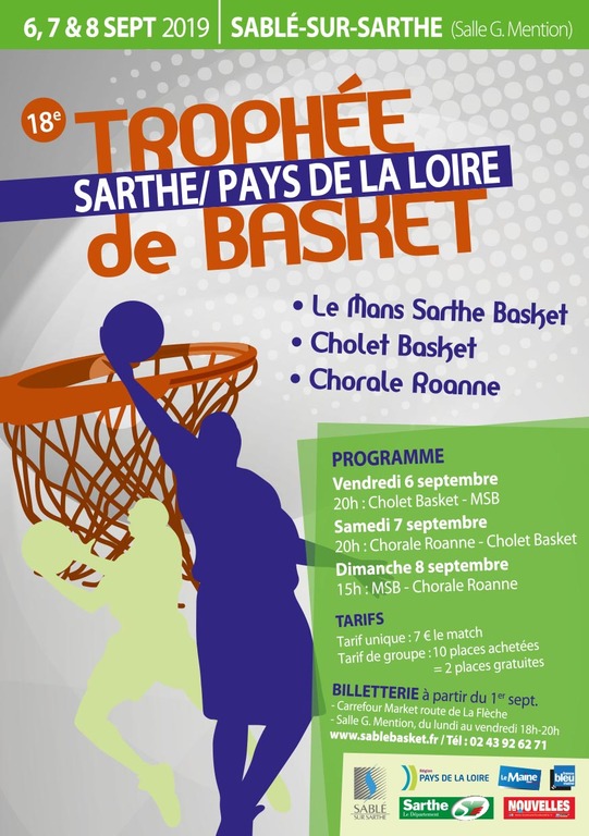 La 18ème édition du Trophée Sarthe Pays de la Loire aura lieu les vendredi 6, samedi 7 et dimanche 8 septembre. Ce tournoi amical oppose traditionnellement trois équipes de Pro A, dont le MSB et Cholet Basket. Le prix des places est fixé à 7€.