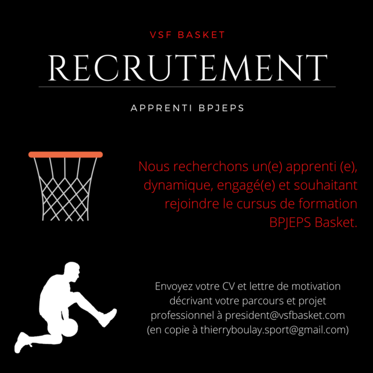 Envoyez votre CV et lettre de motivation décrivant votre parcours et projet professionnel à president@vsfbasket.com (en copie à thierryboulay.sport@gmail.com)