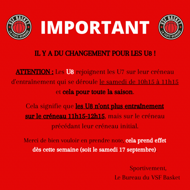 ⚠️ DU CHANGEMENT POUR LE CRÉNEAU U8 ⚠️