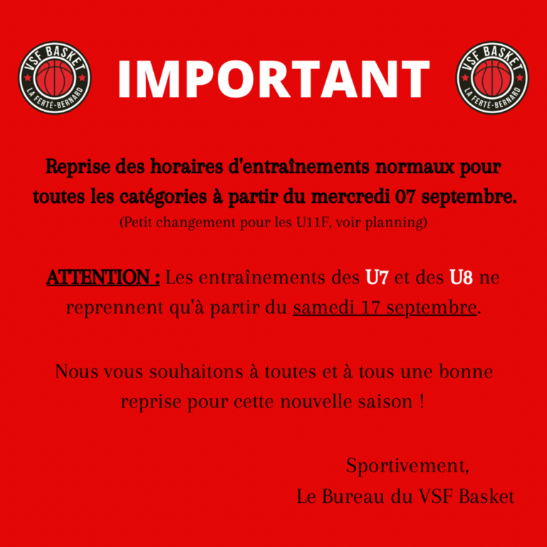 Les entraînements reprennent normalement à partir de cette semaine (aux horaires indiqués sur le planning), excepté pour les U7 et U8 qui ne reprennent que le samedi 17 septembre.